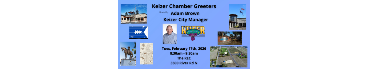Join us for Keizer Chamber Greeters on Tuesday, February 17th at 8:30 AM, hosted by Adam Brown, City Manager for the City of Keizer, at The REC (3500 River Rd NE).